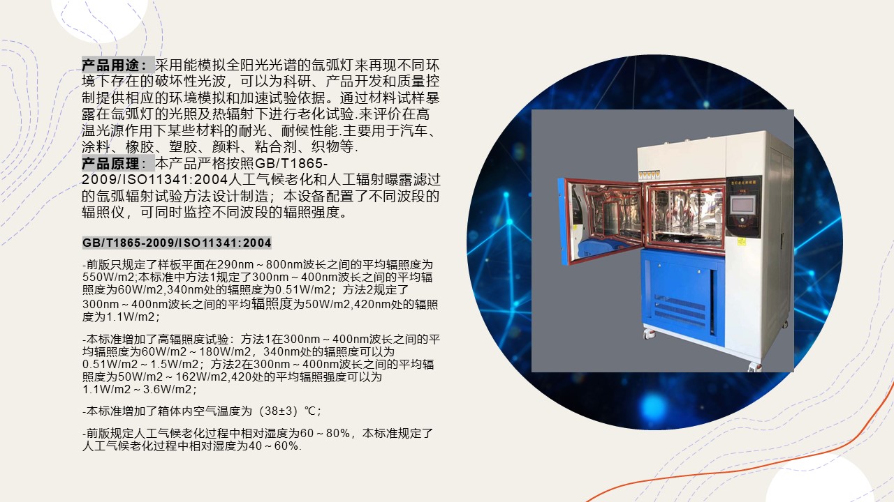 | 辐照度控制(自动调光) | 1、辐照仪:采用特制高精度辐照仪; 2、灯管使用寿命:600~800小时左右 (根据使用中设定的辐照度强弱以及探测点不同灯管使用寿命有所不同); 3、辐照度的控制:可通过辐射仪手动调节功率得到所须辐照度 面板直接显示当前灯管辐照强度; 4、辐照度配置 | ![]() | |||||